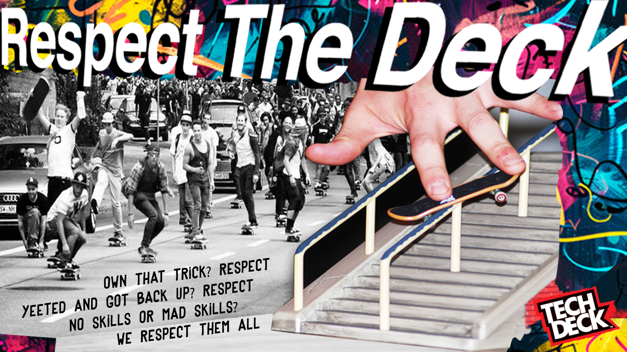 Tech Deck had gotten a little too, um, technical. The brand had lost touch with its skateboard roots. To bring it back, we launched the Respect the Deck campaign, reminding kids and kidults alike that Tech Deck is the OG fingerboard brand and a staple of skate culture for over 25 years. The campaign included posters, a television commercial, and even a gag finger splint. My role included concepting, photoshoot direction, and design.